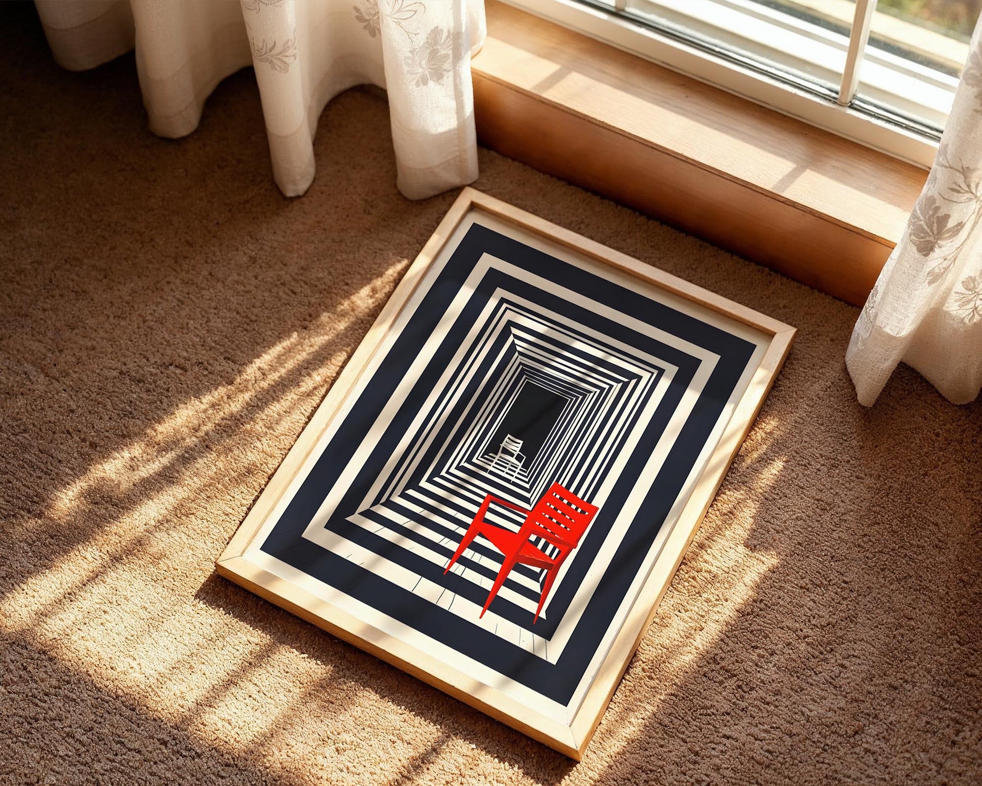 A striking surreal art print featuring a vivid red chair set within a dramatic illusion of repeating architectural frames.